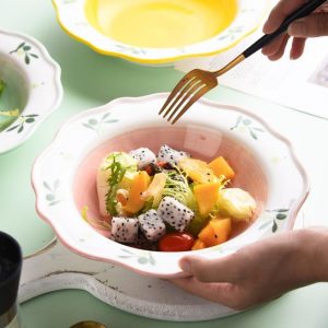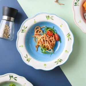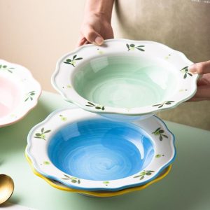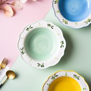 Exquisite porcelain, bright color glaze, create a sense of fashionable color, collision with wonderful food, fresh and elegant, high temperature firing, healthy and hygienic, beautiful and practical. The stroke design is matched with hand-painted patterns, the glaze is bright, fresh and refined, beautiful and not easy to fade. The bottom edge is not glazed, which does not affect the appearance and use.